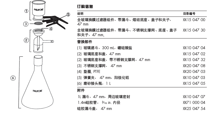 真空过滤水溶液、有机溶液或腐蚀液体,进行颗粒污染分析。 同时建议对 HPLC 溶剂进行过滤。 请与 Millipore 了解过滤有机溶液时可使用的滤膜。 与液体接触的硼硅酸盐玻璃部件,其表面用磨砂玻璃密封。