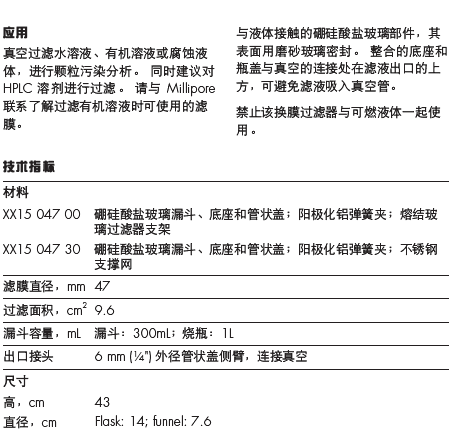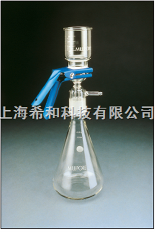 真空过滤水溶液、有机溶液或腐蚀液体,进行颗粒污染分析。 同时建议对 HPLC 溶剂进行过滤。 请与 Millipore 了解过滤有机溶液时可使用的滤膜。 与液体接触的硼硅酸盐玻璃部件,其表面用磨砂玻璃密封。